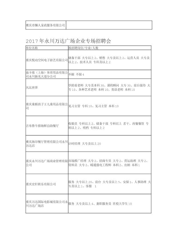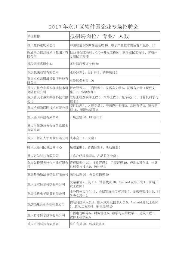 2017年永川软件园、永川万达广场专场招聘会